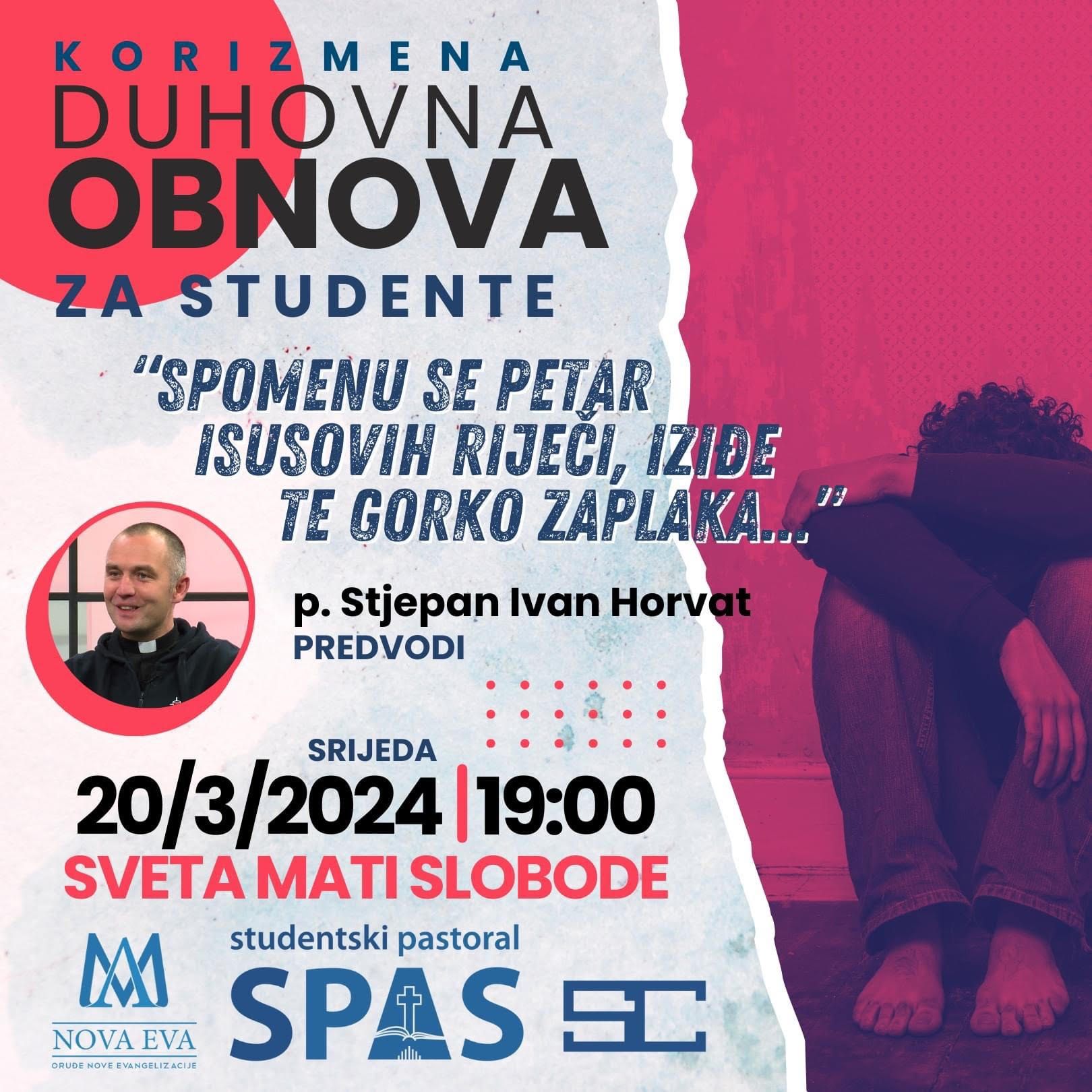 U srijedu, 20. ožujka održat će se duhovna obnova za studente i mlade.