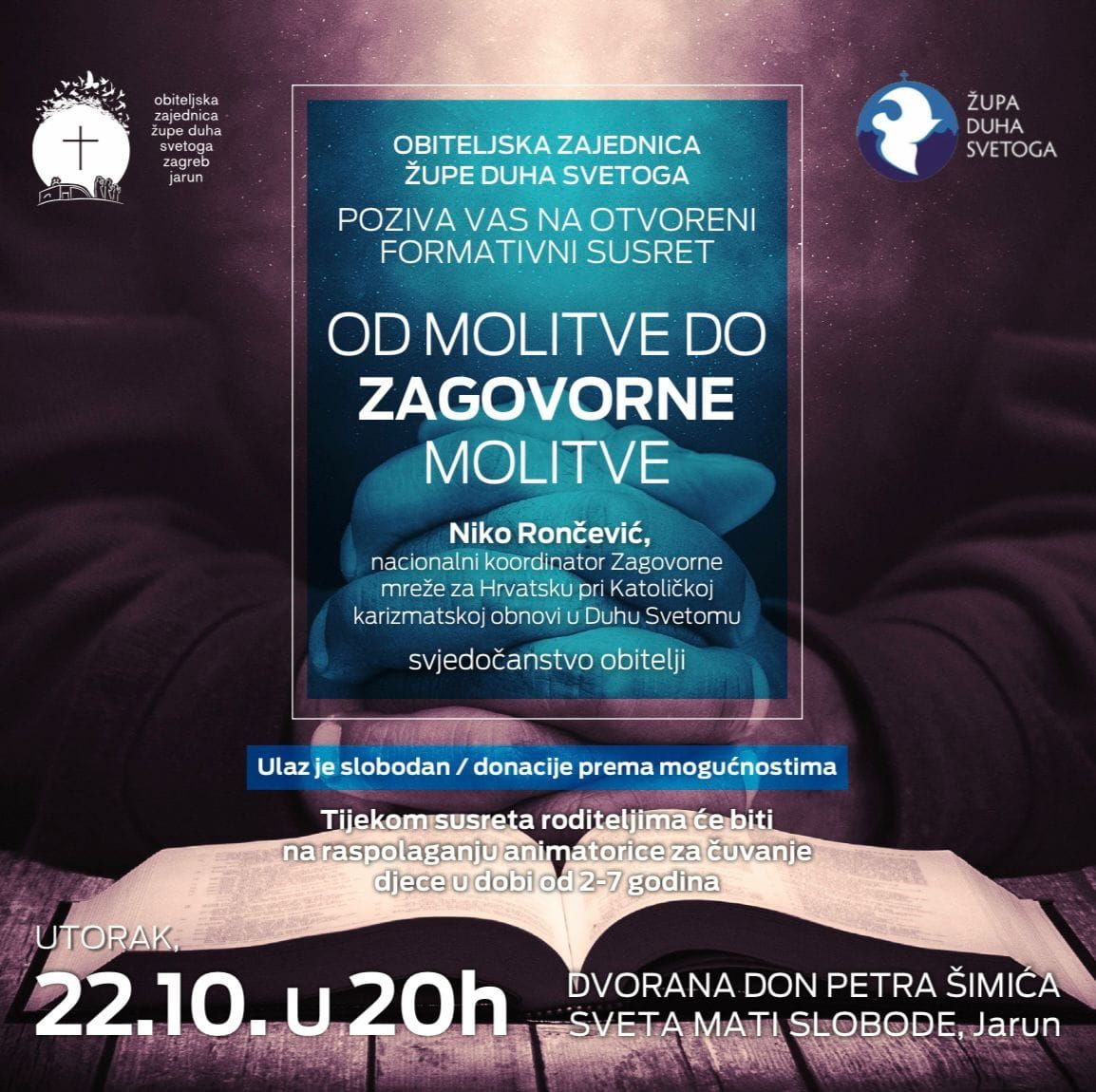 Gost predavač je Niko Rončević, nacionalni koordinator Katoličke karizmatske obnove u Duhu Svetom u Hrvatskoj, a očekuje vas i snažno svjedočanstvo jedne obitelji.